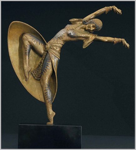 Demeter Chiparus, sculptor român stabilit în Franța la începutul secolului XX, este unul dintre cei mai reprezentativi artiști ai stilului Art Deco. Lucrările sale, realizate în bronz și fildeș prin tehnica chryselephantine, sunt simboluri ale eleganței și rafinamentului epocii interbelice. Inspirat de Baletul Rus și de cultura orientală, Chiparus a creat sculpturi sofisticate, care surprind grația și dinamismul dansatorilor și al personajelor feminine exotice.