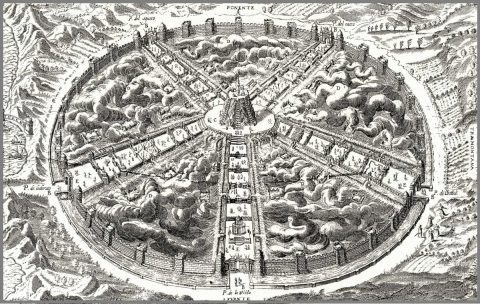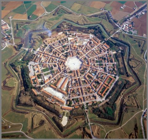 La 7 octombrie 1593, Republica Venețiană a fondat un nou tip de așezare revoluționară - Palmanova. Data înființării orașului a comemorat victoria forțelor creștine asupra turcilor otomani în bătălia de la Lepanto din 1571, în timpul războiului pentru Cipru. Folosind cele mai recente inovații militare ale secolului al XVI-lea, acest mic oraș a fost proiectat ca o fortăreață în formă de stea cu nouă colțuri, fiind proiectată de Vincenzo Scamozzi. Între vârfurile stelei ieșeau metereze pentru ca punctele să se poată apăra între ele. Un șanț înconjura orașul și trei porți mari, păzite, permiteau intrarea. Construcția primului cerc, cu o circumferință totală de 7 kilometri, a durat 30 de ani.